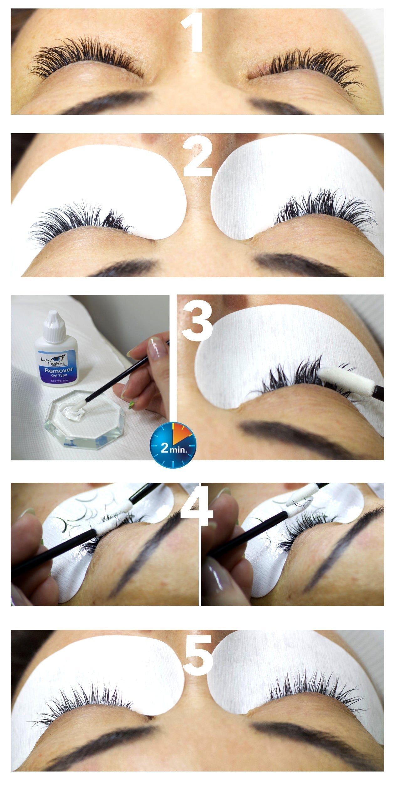 - Start removing by dragging the two microfiber brushes, one under and one over the lashes, from the root to the tips . If any lashes show resistance to being removed, repeat step 3 and continue until all the extensions have been removed.