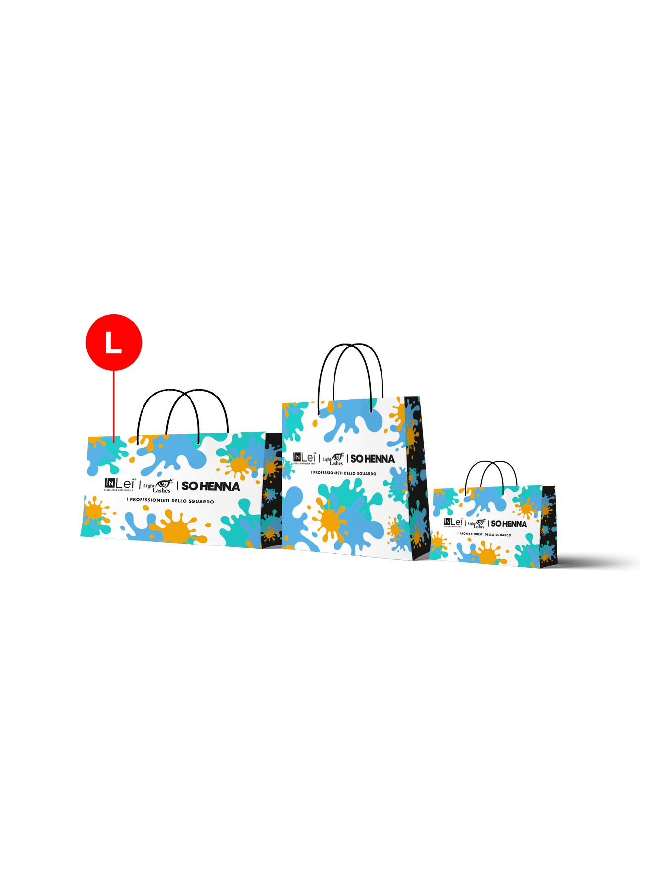 Borsetta in carta realizzata con materiali di alta qualità, con stampa personalizzata dei brand InLei®, Light Lashes® e So Henna®. Il fondo rinforzato assicura resistenza e durata, mentre i manici in cotone offrono una presa comoda e robusta. Il design distintivo, con superficie opaca, è valorizzato da eleganti dettagli lucidi.