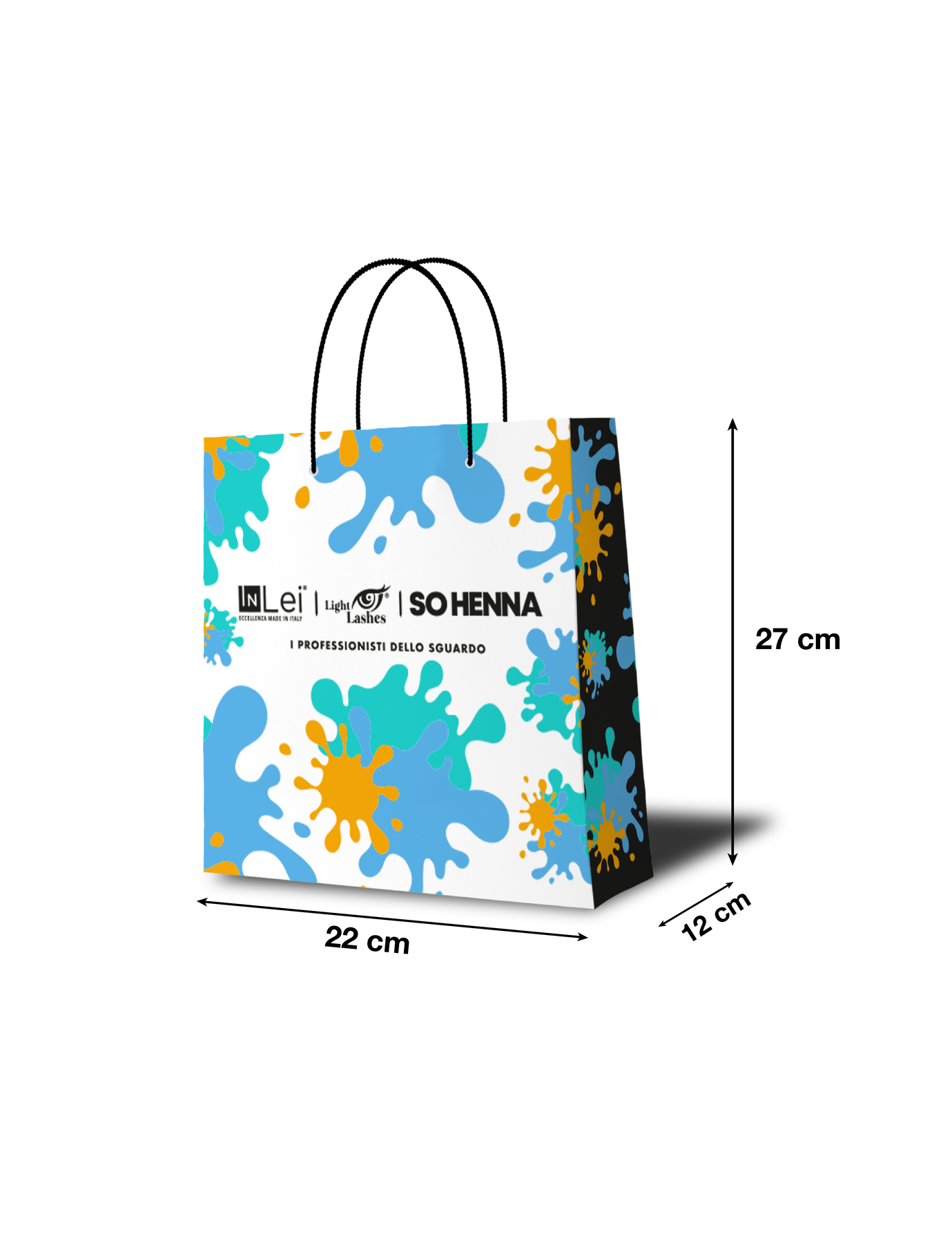 Borsetta in carta realizzata con materiali di alta qualità, con stampa personalizzata dei brand InLei®, Light Lashes® e So Henna®. Il fondo rinforzato assicura resistenza e durata, mentre i manici in cotone offrono una presa comoda e robusta. Il design distintivo, con superficie opaca, è valorizzato da eleganti dettagli lucidi.