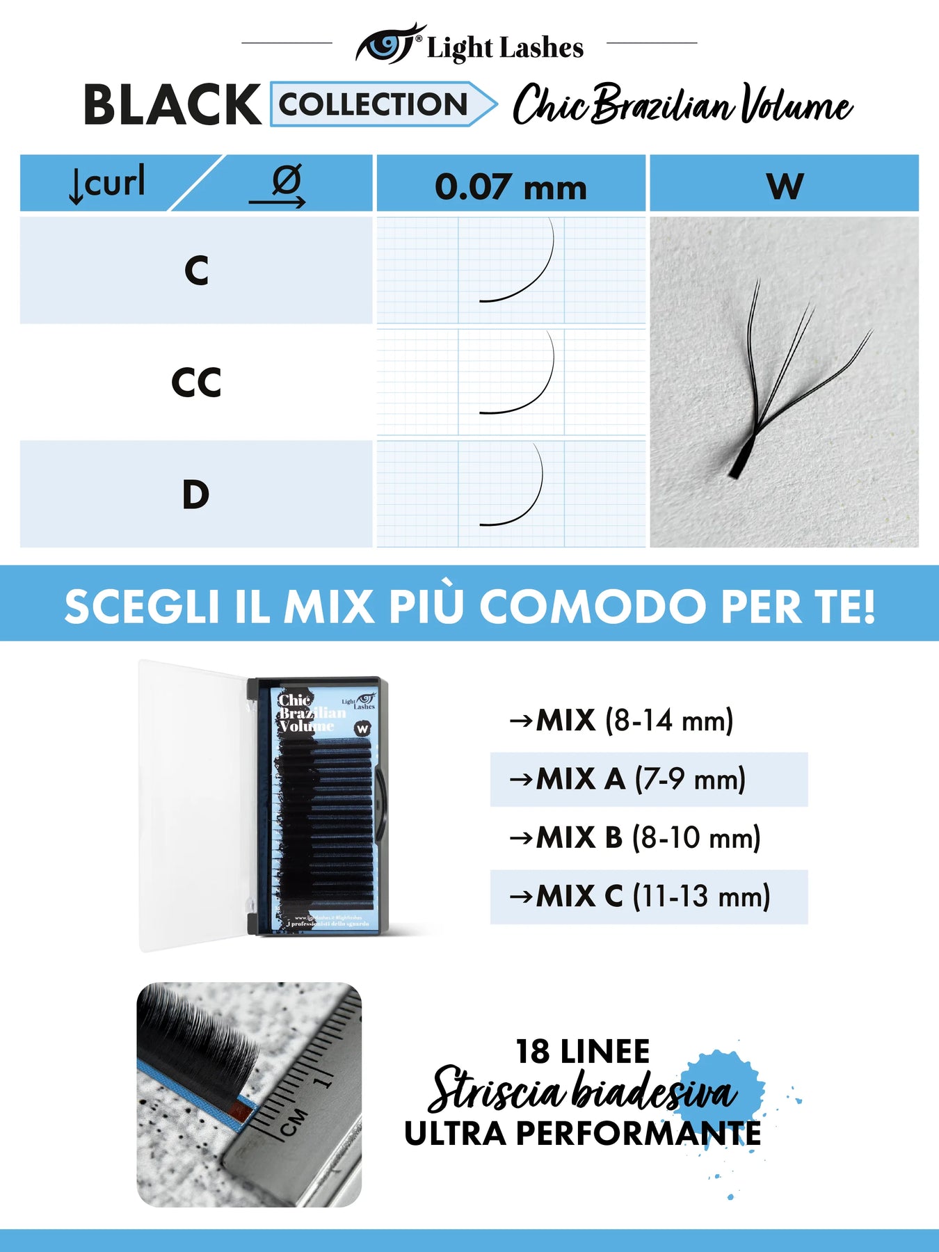 Light Lashes® Black Collection ti porta le esclusive extension ciglia volume Brazilian W, perfette per chi ha sempre poco tempo ma non vuole rinunciare all'effetto wow. Ideali per creare un look magnetico e irresistibile, ma anche naturale e delicato. Con le extension Brazilian W, potrai ottenere un volume sorprendente e uno sguardo affascinante con facilità.