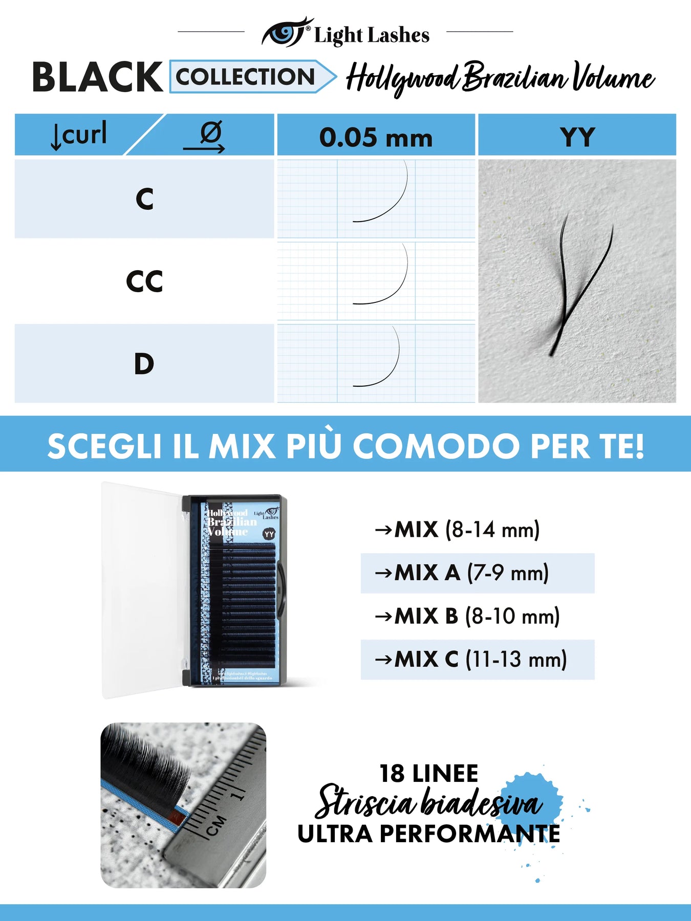 Light Lashes® Black Collection ti porta le extension ciglia Hollywood Brazilian Volume, ideali per creare volumi ancora più pieni con facilità! Perfette per uno sguardo ipnotico e intenso, che cattura l'attenzione con eleganza e fascino. Una scelta innovativa per le lashmaker che amano sperimentare e rimanere sempre all'avanguardia.